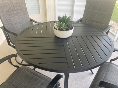 • Patio Perfection: Designed for patio dining, this round slat-top table elevates your outdoor dining experience with its sleek design and practical features.
