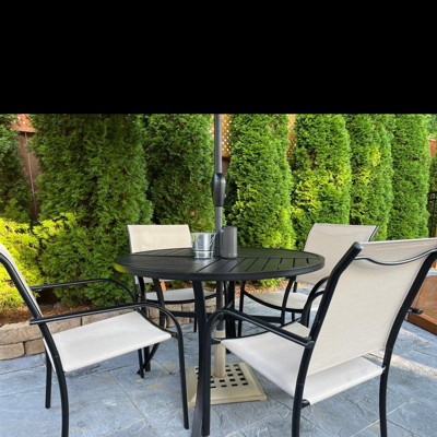 Perfect size, great weight to hold a large umbrella, easy assembly. But it rusts from the screws! I am now trying to figure out the rusty culprit so I can swap the screws for a non rusting material. I like this table enough to keep it and figure out the problem. If you buy this just get different screws.