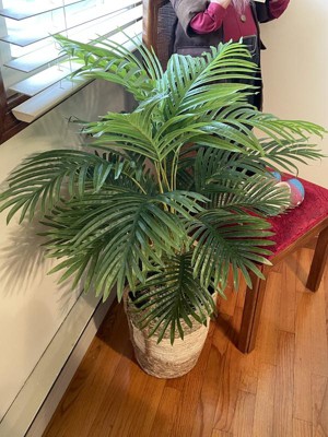 I love indoor plants but don't take the time to keep them alive. I love this palm because it looks realistic and just needs periodic dusting! The top leaves are slightly lighter color than the lower ones, which I remember from real palm plants. I think the basket is particularly pretty--it's got enough pattern/color/texture to be decorative with our mid-century style, but not so much that it distracts from the plant. I included a picture of one frond so you can see that if you look super closely you can tell that it's fake, but I don't have nosy guests over that often, lol.