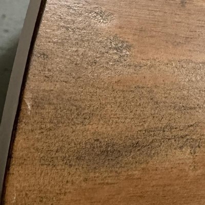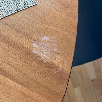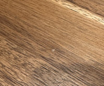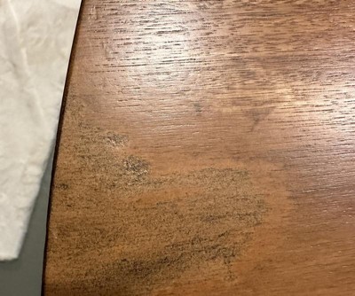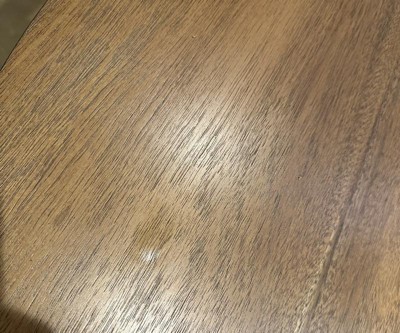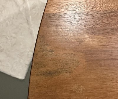 Table top came damaged in one spot, looks like lacquer got smudge off while drying or something? Also has some small dings in the edge where the discoloration is.