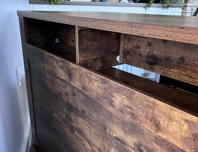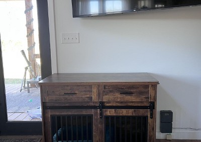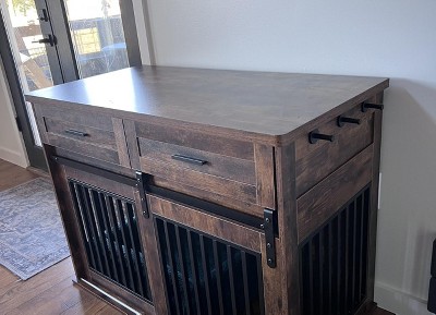 This dog crate was incredibly annoying to put together. I have put together all kinds of furniture pieces before, and never have been as frustrated as I was with this one. If you are patient and creative, you can definitely make it work. The back panel and the drawer panels that were supposed to “slide into place” but had to be aggressively forced into place. They were way too big for the slots. I used a hammer to gently tap them in but it was taking forever and driving me crazy, so my husband took over for those parts. The bottom silver track that the door slides on, was warped and sticking up. My husband helped me screw in a small screw to hold down the end. It pierced through the bottom so we used a small furniture sticker pad underneath to make sure it didn’t scratch our floor. The sliding door is confusing. It doesn’t work unless the screws are only partially screwed in and can easily be knocked off the track. The drawers were particulaly frustrating. The screw placements in the instructions, kept the drawers from going in all the way in so I moved them to the furthest holes. I am not sure why there are such large gaps behind the drawers but oh well.. might make a good place to hide a toy when my dog needs a break from it. It took me a few days to fully finish this peice. Definitely plan for it to take quite awhile and plan for some serious improvising. Now that it is finally assembled, I am happy with the way it looks. The drawers are still very tight and hard to open and close. I am hoping that will get better with time. The door does not slide smoothly and one of the screws on the back is cutting a line into the panel behind it. I do think the door lock will work well and I like the hooks on the side for our dog’s leash and other items. It seems sturdy and I hope it will hold up well.