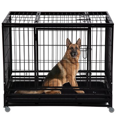 42 Inch Sliding Rail Dog Cage, Heavy Duty Large Metal Kennel with Dual Doors, Flexible Divider, Removable Easy-Clean Tray and Rolling Casters