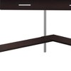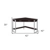 This 42-inch dark brown and silver corner computer desk will help to turn your office space into an executive suite. Featuring a great space saving design, this corner desk corner desk is a perfect option for that corner nook in your living room, home office or bedroom. A single drawer gives this desk some hidden storage for your office essentials. Forged with premium craftsmanship and design, this desk is built to last. 30-inch H x 42-inch W x 42-inch D