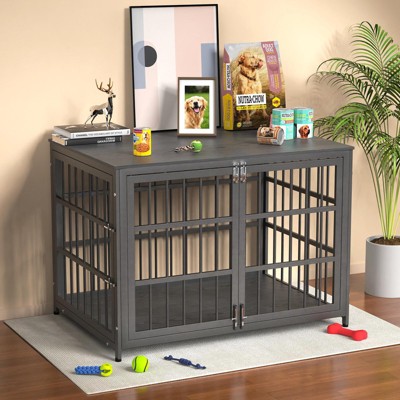 42in Metal circular dog cage, equipped with 4 safety locks, sturdy and durable wooden decorative dog house, multi-functional table-type dog cage
