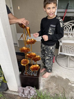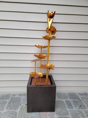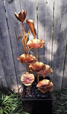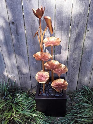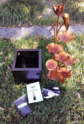 [This review was collected as part of a promotion.] The copper color of this Metal Leaves Cascading Fountain is absolutely beautiful! With the easy-to-follow instructions, I had this fountain set up & running in no time. Just fill the base with water, place the water pump into the base, attach the flow control tube to the pump & the bottom of the fountain, set the fountain on the base, add the river rocks & plug it in. The water quickly begins to flow & the peaceful sounds of the trickling water is mesmerizing. The fountain is at the back of our yard next to the fence for now but we hope to have a rock garden completed by next Spring & will include the fountain in that area. This is a great focal point in our yard & we have gotten so many compliments from friends & family.