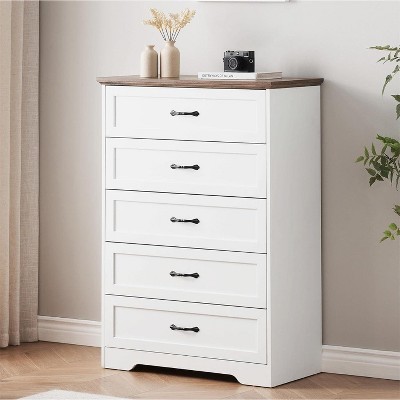 44" Tall Farmhouse 5 Drawer Dresser, Wooden Storage Chest with Metal Handles, Modern Rustic Cabinet for Bedroom Living Room Hallway, White and Brown