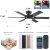 This 46" low-profile black ceiling fan features a high-efficiency pure copper DC motor (90-265V) while delivering powerful airflow at under 35dB noise. The reversible 6-speed fan provides year-round comfort with seasonal airflow adjustment. It includes smart APP/remote control for adjusting speeds, 2-hour timer, 3 color temperatures (white/warm/neutral), stepless dimming, and reverse function - the remote doubles as a wall switch. The integrated LED light offers full-spectrum, flicker-free illumination with memory function for preferred settings. Designed for easy installation (under 1 hour) with 5 reversible wooden blades and included English manual/online video. Backed by a 1-year warranty and 24-hour customer support, this versatile fan suits living rooms, bedrooms, patios, and covered outdoor spaces.