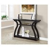 Grab your guests' attention with this stylish cappuccino accent console table. Featuring a unique curved base and a three tiered open concept design, this modern unit is perfect for dressing up any wall in your home or displaying your favorite decorative items.