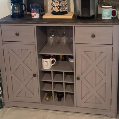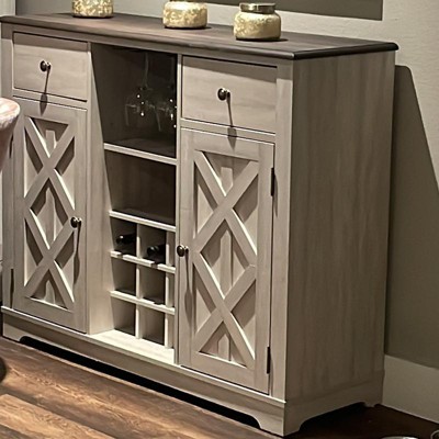 Keep your wine stored in an organized way with this wine cabinet. A built-in wine rack lets you store up to nine bottles of your favorite wines, glass doors and reveal shelved storage for plates, serveware, and handles of your preferred spirits, while lower shelf is great for showing off display plates or mugs.