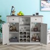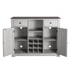 Keep your wine stored in an organized way with this wine cabinet. A built-in wine rack lets you store up to nine bottles of your favorite wines, two side doors open to reveal shelved storage for plates, serve ware, and handles of your preferred spirits, while one open lower shelf is great for showing off display plates or mugs. The center upper console features two drawers for keeping small accessories like fork, spoon & etc. Golden round knobs allow easy access to the drawer and cabinet.