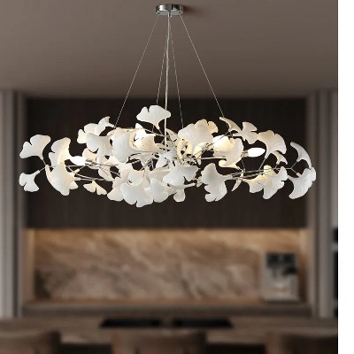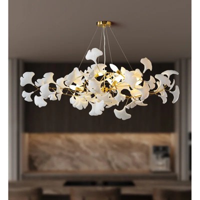 Introducing the exquisite Ginkgo Leaf Dining Room Chandelier, a clever blend of iron and ceramic, meticulously embellished with a sophisticated electroplated finish. The epitome of luxury and sophistication, this chandelier elevates your dining environment to unparalleled heights. Intricately designed, it brings a warm 3000k glow to your space, perfectly creating an ambience conducive to an extraordinary dining experience.