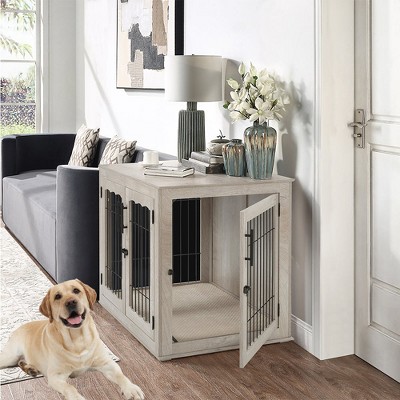 47'' Wooden Dog Crate Furniture, Heavy Duty Dog Kennel Indoor with 2 Barn Doors, 2 Storage Draws & Removable Divider for Home Grey