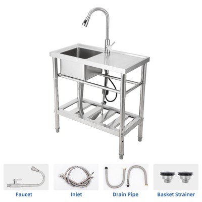 Stainless Steel Utility Sink, Freestanding, Single-Bowl, Pull-Out Hot/Cold Faucet, 2-Tier Shelf, Leveling Legs for Laundry/Kitchen