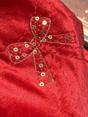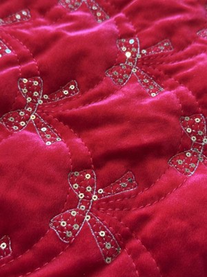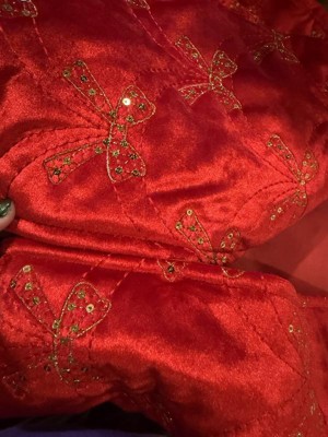 This 48" Christmas Embroidered Bow Velvet Tree Skirt by Wondershop is absolutely beautiful. The Red is very rich and vibrant - it’s like a ruby red - very christmas. The tree skirt is relatively thick which really helps with its luxurious look and feel. It’s very soft . The bow design adds a touch of cute. The bows have a gold color Sequence design in them. Overall highly recommend this tree skirt.