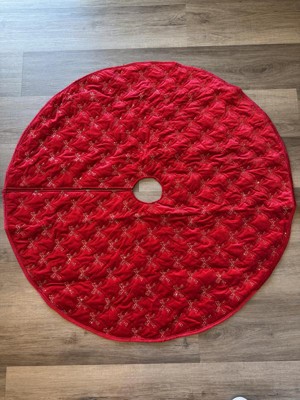 Anchor your holiday tree with this 48-Inch Dia Velvet allover Sequins/embroidery Bow Tree Skirt from Wondershop™. Made from polyester, this red velvet tree skirt features a stitched mermaid scale pattern, highlighted with gold-color bows with sequin and embroidered accents for a festive look. Great for keeping sap and fallen needles off your floor, the skirt features a 48-inch circular silhouette for ample floor coverage.