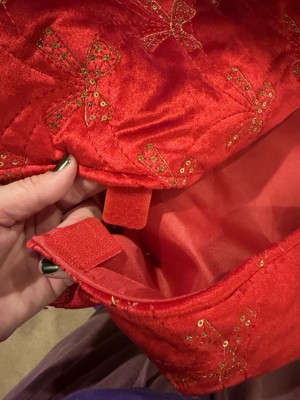 This is a very fancy little tree skirt with lovely vivid red color and sparkly gold sequins. It looks to be well made and should hold up for a long time. The opening is quite small compared to the size of the skirt. I would like it to be larger to work for a wider range of tree sizes.