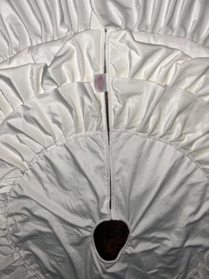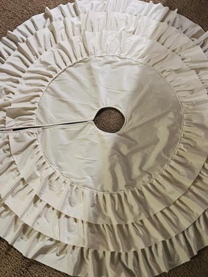 Wondershop 48” Christmas velvet tree skirt has 3 layers of ruffles in white color. The texture is so soft and this skirt is well made. I love the ruffles because they are flare, it has Velcro in both sides to close up wich make it easy to use. I really can’t wait to use it this upcoming Christmas!!