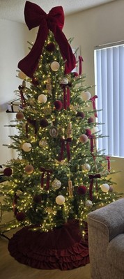 This is a beautiful tree skirt and the material looks expensive!!! The color is so perfect. It’s not a bright red but more of a berry color. It’s really pretty. The ruffles add a lovely touch!