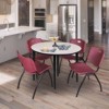 Kahlo tables are a mid-century modern take on the standard post leg table and have an attractive tapered leg. Kahlo post legs come four to a set and assemble in a snap with just a few screws to this 42-inch Round top. The table is constructed of a thermal fused melamine laminate tabletop that is 1-inch thick and finished with a black T-Mold edge band. This Ash gray