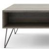 Style and convenience are at work in this uniquely functional Moreno Lift-Top Coffee Table. The top lifts up to reveal hidden storage, pulling toward you for the perfect surface to type on your laptop or eat in front of the television. The table features two open compartments for stacking books or displaying decorative objects. Black iron hairpin legs along with Solid Wood add an industrial component.