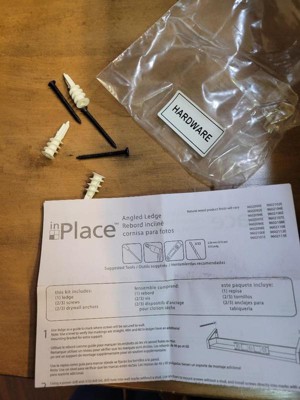 The shelf and packaging had a very strong, fairly unpleasant smell. I recycled the packaging and let the shelf air out, and after about a week, I no longer noticed an unpleasant odor. This comes with 3 wall anchors, 3 long screws, and an instruction sheet. We didn't read it (since one of us was convinced he knew how to do it) marked & measured the holes, used a level and then quickly hung the shelf upside down. It actually looks good either way. We did flip it, and it is more difficult to mark and level the way it's supposed to hang. It's not as steady on the wall, and kept shifting as we tried to mark the holes. The shelf is narrow, but great for photos, small plants and other small decorative objects. The wood and metal looked best against lighter walls, and the shelf seems sturdy. We're going to play around with the height and what we want to display, but overall we really like it.