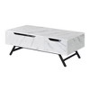 The coffee table boasts a spacious rectangular tabletop, perfect for holding drinks, books, or decor items, supported by modern metal splayed legs for stability and style. It features a convenient lift-top mechanism revealing a storage compartment and an additional drawer with side metal glides for smooth operation, complemented by cut-out pulls for easy access and a sleek aesthetic. Product Details: