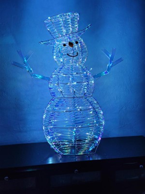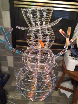 [This review was collected as part of a promotion.] This is a nice pre-lit holiday decoration. It is made out of translucent mylar that is wrapped around a wireframe. It is iridescent which makes it look like it is changing colors depending on how the light falls on it. There are stakes to tie the snowman down outside or it can also be used inside. It was a little tricky to put together.