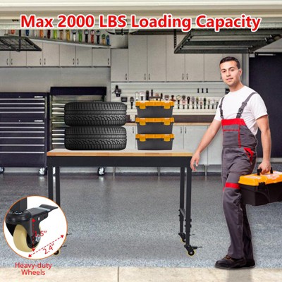 This 48-inch workbench features a sturdy steel frame and solid wood top, supporting up to 2000 lbs for heavy-duty tasks like woodworking or welding. Its height adjusts to six levels (27.8"–39.5") for comfortable sitting or standing use, while a built-in power strip with 4 outlets and 2 USB ports keeps tools powered. Assembly is simple, and a side pegboard with hooks adds organized storage. Four lockable wheels and non-slip feet ensure stability during use and easy mobility around the garage.