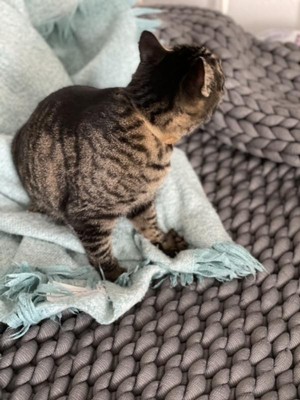 [This review was collected as part of a promotion.] Tranquility Chunky Knit Weighted Blanket... The material is soft, smooth, it feels very comfortable against the skin. Still not sure 'weighted' is what I prefer, instead of feeling 'hugged' it makes me feel trapped, unable to move. Plus I should have researched cleaning: 100% polyester, yet only spot clean, cannot place in washing machine/dryer. As I have a house full of various pets, not practical to leave out.