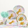 Make your little one's birthday an occasion to be remembered forever with the addition of the Sparkle Unicorn Collection. Featuring glistening foil stamped unicorns in a brilliant gold color with shimmering stars and vibrant multi-colored stripes, this ensemble is sure to have all the birthday girls in high spirits. Don't be left without this beautiful display of napkins, plates, table covers, party decor, and more!