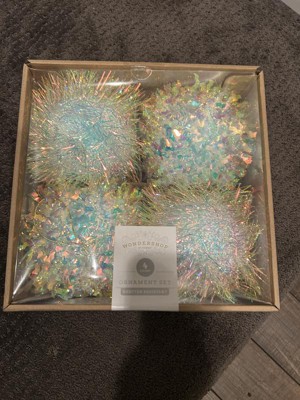 I like this set of four ornaments. Given their size they are pretty lightweight and should stay well on the tree. I was worried the tinsel would fall off easily but they seem to be fairly sturdy. I like that they are large and add a touch of fun.