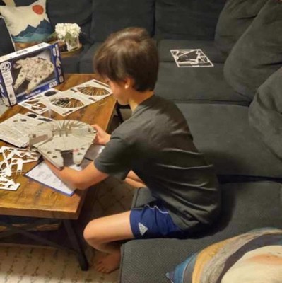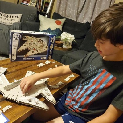 the millennium falcon. After doing the Ironman with 1/3 the pieces, we started the falcon. Unlike the Ironman one this one has much more intricate and precise pieces. But as you see it come together it is worth the extra time on it. This one is definitely for teens and needs a little more attention to detail. Bu still a good project for a ten year old with a little help on the bent parts. With the falcon being almost 300 pieces and much more detailed. This one came with glue and that made putting it together a bit easier, but a bit more time as you had to what a few minutes for each spot to dry. Great as a project to come back to or a rainy day puzzle. I'd give this a 5 out of 5 as well just for a little older kids. More preteen to teen (without help).