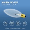 Brighten your space with this 6-pack of 120V 7W C7 clear light bulbs. Featuring a candelabra E12 base, they're perfect for window candles, holiday décor, night lights, and small lamps. The classic torpedo shape and nickel-plated base ensure a secure fit and long-lasting performance. Enjoy steady, flicker-free light with easy screw-in installation. Ideal for everyday use or festive displays, this reliable set is great for replacing chandelier or Christmas village bulbs.