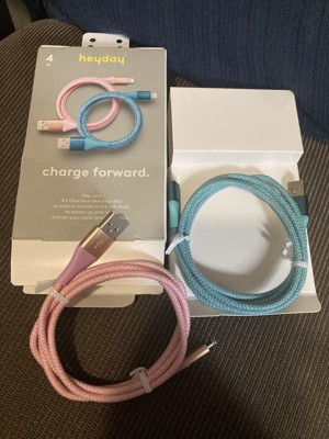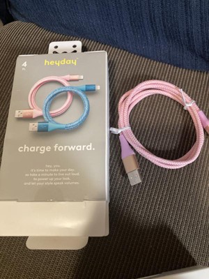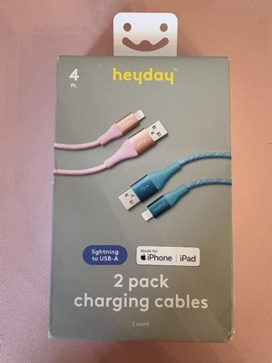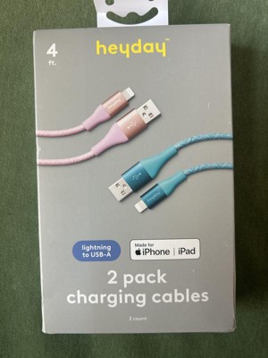 The 4ft USB-A to USB-Lightning Cable 2pk from heyday™ in Bright Lilac and Turquoise offers a reliable connection for your devices. With a length of 4 feet, these cables provide ample reach for charging and data transfer. The braided design enhances durability, reducing wear and tear. Compatible with Apple iPhone and select iPads, these cables ensure seamless connectivity.