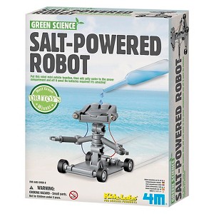 Create a robotic racer using the 4M Salt Water Powered Robot Kit. This robot kit is a hands-on learning experience that illustrates the value of alternate energy sources. The robot is powered by the chemical reaction of salt water and charcoal, and is safe and non-toxic. This kit contains all the parts and materials needed to create a salt-water powered robot. Detailed assembly instructions included. Recommended for ages 8 years and up. This robot kit is a hands-on learning experience that illustrates the value of alternate energy sources. The robot is powered by the chemical reaction of salt water and charcoal, and is safe and non-toxic. This kit contains all the parts and materials needed to create a salt-water powered robot. Detailed assembly instructions included. Recommended for ages 8 years and up.