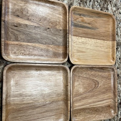 A: The set includes four pieces of wood square serving platters.