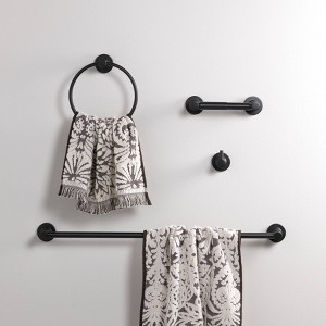 - Includes 24-in. towel bar, towel ring, robe hook, and toilet paper holder