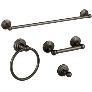 The Design House Calisto 4-Piece Bathroom Accessory Kit completes the look of your bathroom with a towel ring, robe hook, towel bar and toilet paper holder. Use all four pieces for a cohesive look throughout the bathroom. Made of zinc and aluminum with an oil rubbed bronze finish, the concealed screws add a casual elegance to your bathroom. Ez Anchor mounts are included in this kit for installation on drywall and a mounting template is printed on the back of the package. Anchors are a cleaner alternative to plugs. Save time and create a sturdy mount. Complete the look of your home with the rest of the Calisto collection, which features other bathroom accessories. Designed and manufactured by Design House, the trusted source for quality lighting, hardware, plumbing, kitchen, and bath products for every taste and budget.
