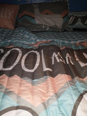 This cool design brings a fun novelty edge to any kid's or teen's bedroom. The zig zag chevron pattern sets the perfect background for the cool sunglass-wearing llama. The colors of this quilt set create a calming vibe both parents, kids and teens love. Who wouldn't love the fun designs on this quilt set for their bedroom or dorm room? The llama keeps it cool with a flashy pair of sunglasses on top of the chevron background. The decorative pillows feature more even more creative designs to add to this fun theme. The breathable fabric makes this quilt set perfect for all seasons. This set is also reversible giving you two looks in one. The four piece quilt set includes one quilt, one sham, and two decorative pillows. Please refer to the product labels for full care instructions.