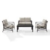 Add simple elegance to your outdoor area with the Kaplan Collection. This four-piece set is made with rust protected premium steel with an oil bronze finish. The cushions have a moisture-resistant and UV-resistant cover to protect against fading. This set includes a loveseat, two chairs, and a coffee table. It is easy to assemble and even easier to enjoy.
