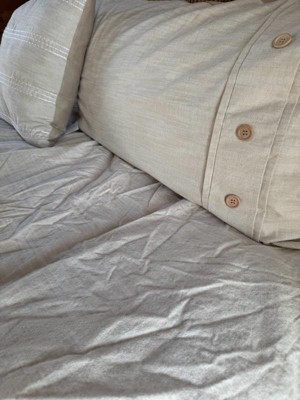 [This review was collected as part of a promotion.] I'm loving this five-piece duvet cover set. It is the most perfect neutral shade and will go with any color any style of bedroom. There are small little details that make it unique and not plain. The comforter and pillow cases have wood buttons that add to the look. The accent pillow has white stitching detail that is really cute. The comforter itself is a nice weight and size. It is labeled as oversized but I find it about the same size as my other king comforter sets. I really love that the top has texture and the underneath side is smooth so it's more comfortable to sleep with. Same thing on the pillows which is nice too. The other feature that I really love is that the comforter is removable so I can wash the duvet cover anytime I want. I really love this set and I plan on using it for a very long time.