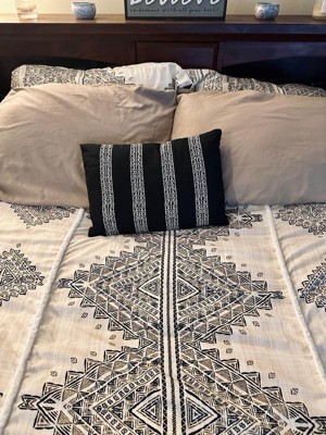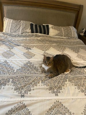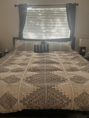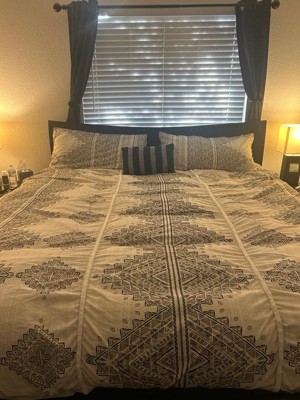 [This review was collected as part of a promotion.] Stylish king size duvet set! I’m really enjoying this new set for spring. The print is stylish with a tan, black, and cream color scheme. The duvet cover fits perfectly over my king size down alternative duvet. It has ties inside so that the mattress does not bunch up. It has a row of buttons on one end that makes it easy to take on and off for cleaning. I laundered it upon receiving it and it was in great condition after the dryer. No loose threads. Works well with a tan sheet set that I already own. The accent pillow works great as a decorative piece but also to prop up my iPad at night. Very happy with this stylish and comfortable set!