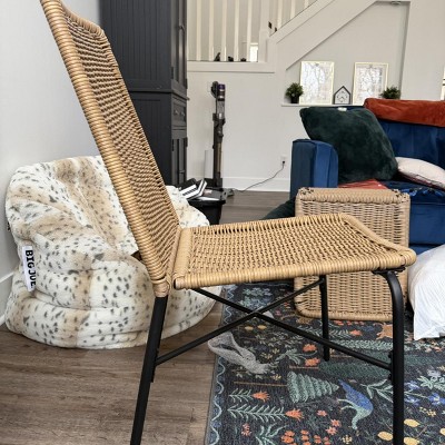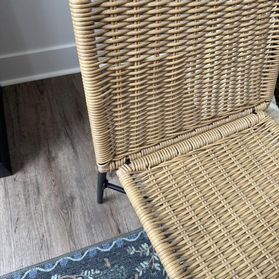 Add a touch of traditional style to your seating ensemble with the 4-Pack of Wicker Stack Armless Chairs from Threshold™. These four chairs feature an armless design with a saddle-like seat and a back for comfy sitting. Made with a black steel frame, these brown chairs have a woven wicker construction for a textured look. Best of all, the pieces are weather resistant, making them perfect for use on your porch or patio.