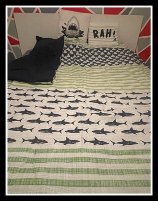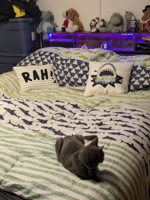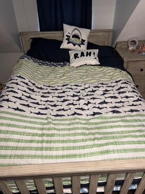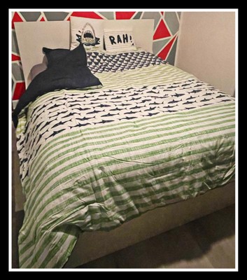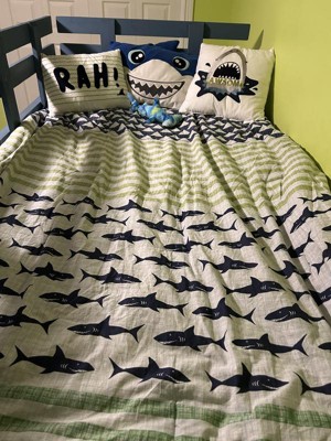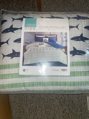 [This review was collected as part of a promotion.] The Urban Habitat Kids Finn Shark Cotton Comforter Set in Full/Queen is an excellent choice for any child who loves marine life. The vibrant green and navy color scheme adds a fresh, lively touch to the bedroom, perfectly complemented by the playful shark design. The cotton material is soft and comfortable, ensuring a cozy night's sleep. One of the standout features of this comforter set is its attention to detail. The stitching is well-done, and the print quality is impressive, with the sharks looking sharp and engaging. The comforter is lightweight yet warm, making it suitable for use year-round. It also washes well, maintaining its color and shape even after multiple washes. In terms of usability, the set includes matching shams that tie the look together beautifully. The overall design is versatile enough to grow with your child, making it a practical investment. The comforter and shams fit well on a Full/Queen bed, providing ample coverage without being too bulky. Overall, the Urban Habitat Kids Finn Shark Cotton Comforter Set combines fun design with quality materials, making it a delightful addition to any child's bedroom. It brings a touch of the ocean indoors, sparking imagination and providing a comfortable sleeping experience.