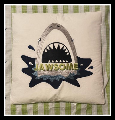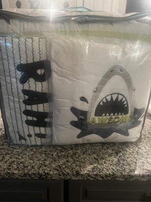 [This review was collected as part of a promotion.] The print of this set is adorable. Fun colors that make sense and don’t clash - Cute shark print - Love the personality of the “jawsome” pillow - But I’m not thrilled with the quality. Our pillows have been out of the vacuum-sealed bags for about a week now, and they are still pretty pancake flat. Definitely for looks only, and not for function. The comforter could’ve been of better quality when it comes to the sewing. A lot of navy string in the white and green areas - “bunching” at the joints. Several long strings connected from one area to another - This made me nervous, as I wouldn’t want one of my kiddos getting a finger / toe wrapped up in the middle of the night. A cute concept, I just the execution and quality was done better.