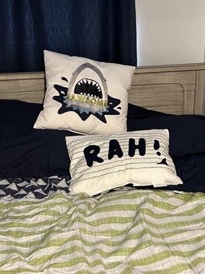 The Urban Habitat Kids Finn Comforter Set provides a fiercely fun update to your child’s bedroom. The 100% cotton comforter sports a shark and stripe print in navy and green colors that pops on the light grey background. A solid navy reverse adds a bold splash of color, while coordinating shams (1 for Twin Sizes) complete the look. Two decorative pillows with embroidered details provide the finishing touches to the comforter set. Machine washable for easy care, this “Jawesome” comforter set is sure to make a splash in your bedroom. This bedding set is OEKO-TEX certified, meaning it does not contain any harmful substances or chemicals, and uses an antimicrobial treatment that provides built-in freshness protection, reducing the growth of odor causing bacteria to keep fabric lasting longer.