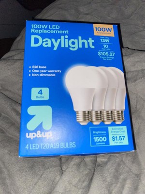 Illuminate your home or office with this 4-Pack 100W Lightbulb Set from up&up™. These LED bulbs produce the same brightness as the 100-watt bulb, consuming only 13W of energy. Featuring an E26 base, the A19 bulbs cast a cool white glow, making them ideal for spaces that demand clear, bright lighting. The non-dimmable bulbs are great for kitchens, workstations, and garden fixtures.