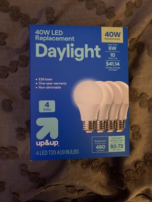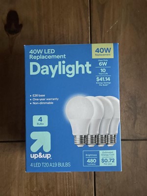 Brighten up your living space with this 4-Pack 40W Lightbulb Set from up&up™. These LED bulbs produce the same brightness as a 40-watt bulb and consume only 6W of energy. Featuring an E26 base, these A19 bulbs cast a cool white glow that mimics outdoor light for clear visibility. These non-dimmable bulbs are great for frequently-used fixtures like lamps, overhead kitchen lights and more.