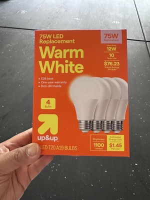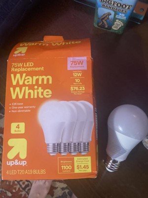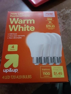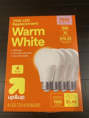 Upgrade your interior lighting with this 4-Pack 75W Lightbulb Set from up&up™. These LED bulbs produce the same brightness as a 75-watt bulb and consume only 12W of energy. Featuring an E26 base, the A19 bulbs cast a warm white glow for a cozy ambiance that's perfect for frequently-used lamps or overhead fixtures.