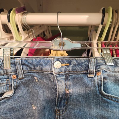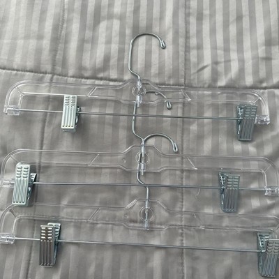 [This review was collected as part of a promotion.] These are sturdy hangers, great for skirts, leggings or pants. Adjustable clips makes them appropriate for all sizes, from babies to adult. I have no issues or complaints with these brightroom hangers. I plan to buy more for back to school, as we always need skirt/pants hangers. Their clear color gives them ensures that they match any other hangers that are already in your closet. I received an incentive to write this review.